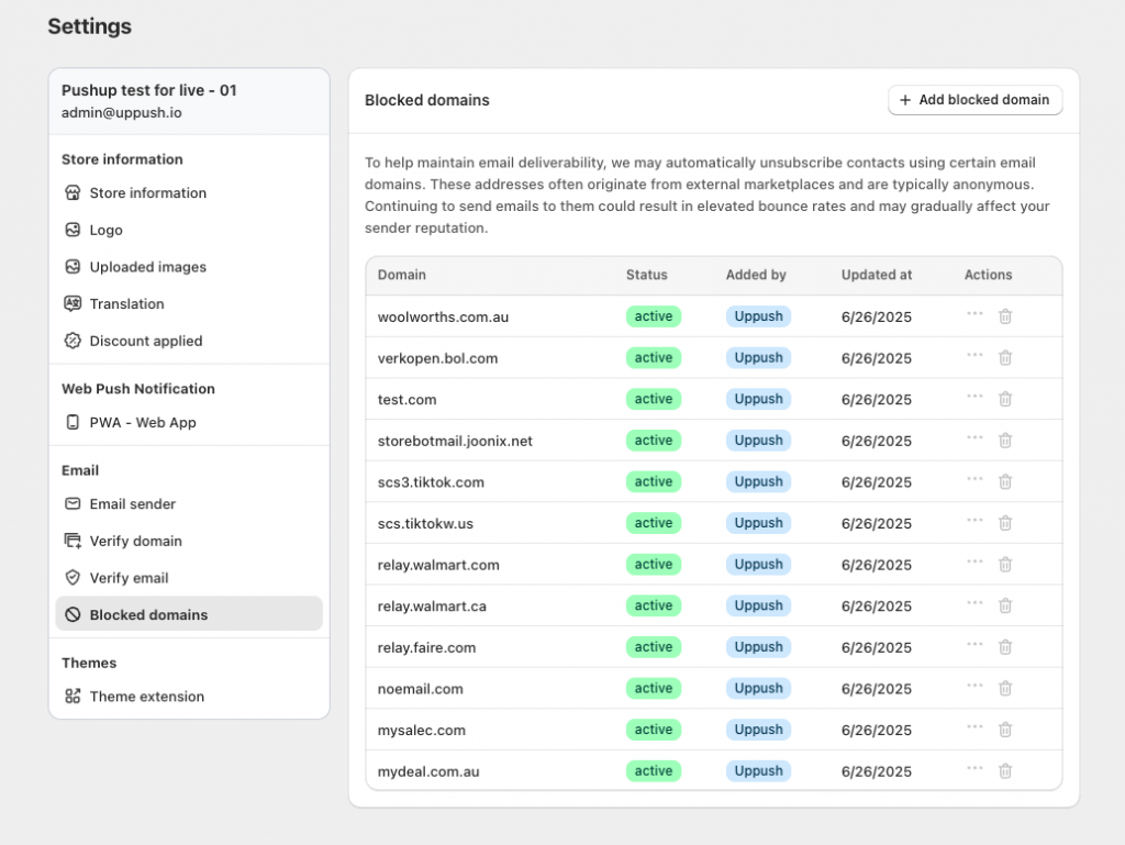 To help prevent that, Uppush now gives you a way to automatically block or unsubscribe contacts using specific email domains — so you stay in control of your list quality.